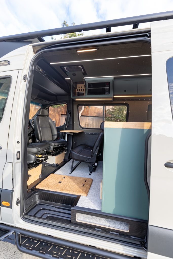 The M4 notably features a second row of seating, large internal kitchen galleys, and a powerful off-grid lithium battery system. Also featuring a East-West sleeping bed utilising sleeping pods, and elevated enough to store mountain bikes in a spacious gear garage.